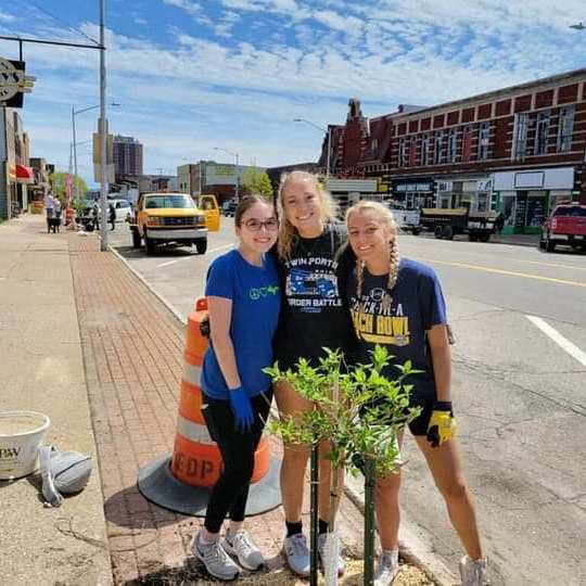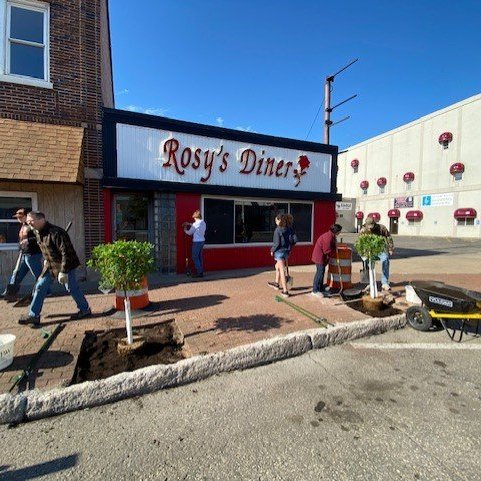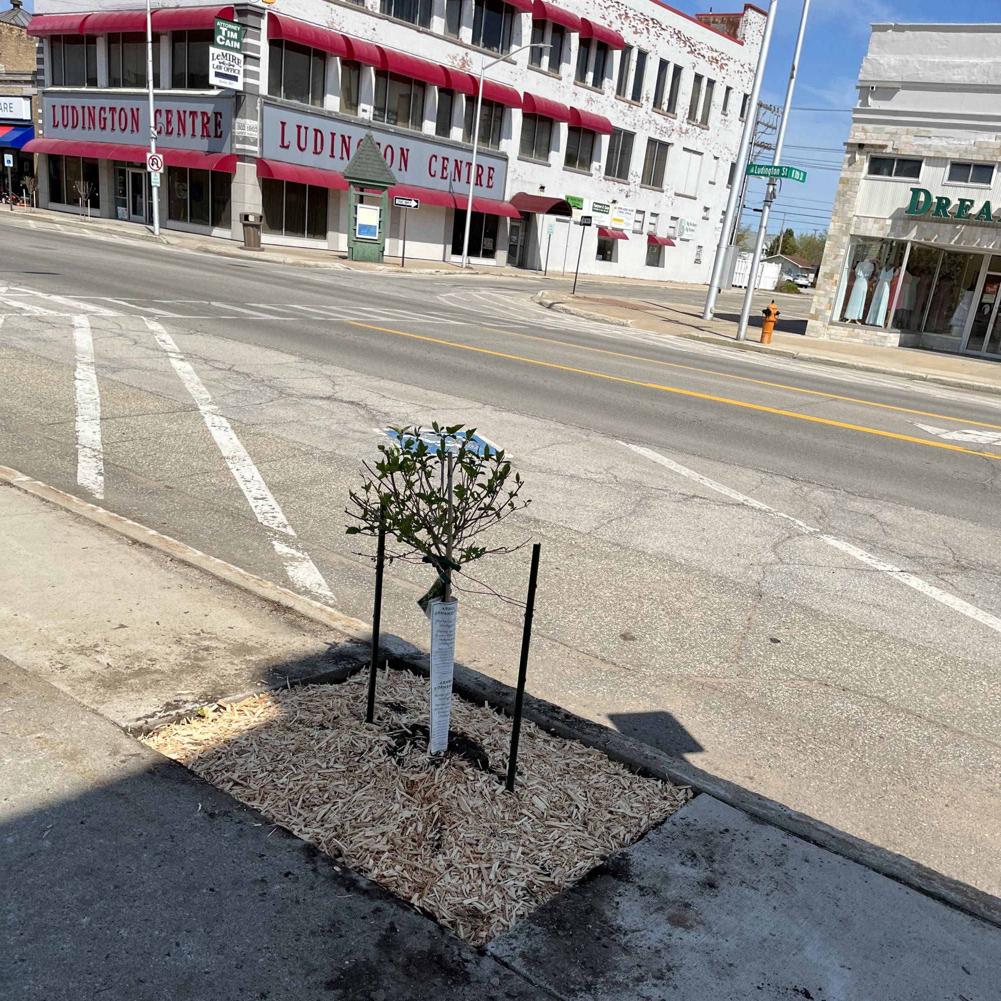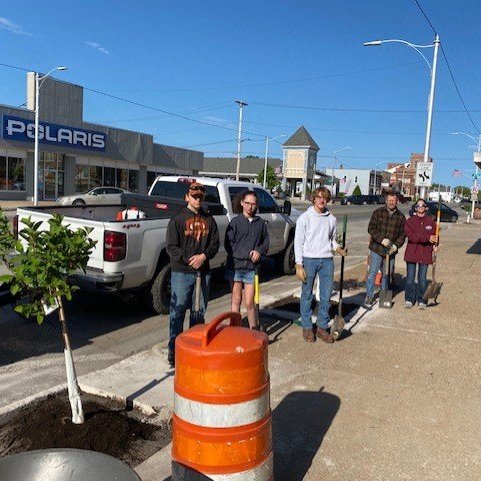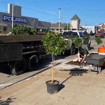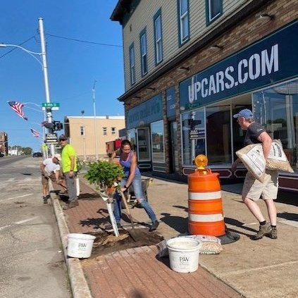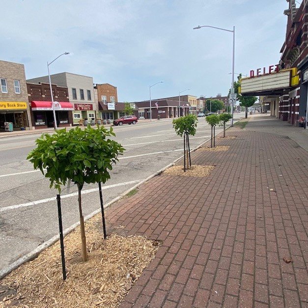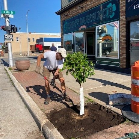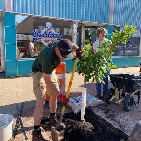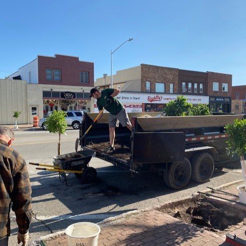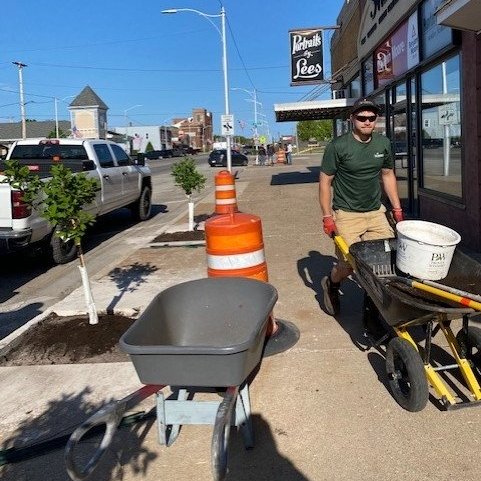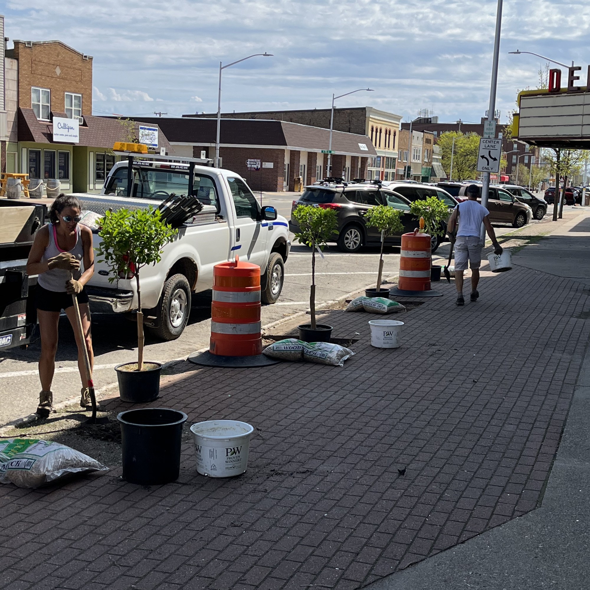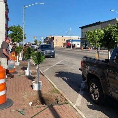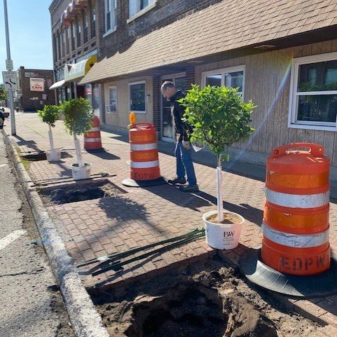 This project needed cement squares to be cut into the sidewalk, existing dirt to be removed and replaced with potting soil, trees to be placed at each of the 94 tree locations and then planted, staked, secured with wire, and mulched. The final step in this process was a City of Escanaba water utility truck stopping and watering each tree.